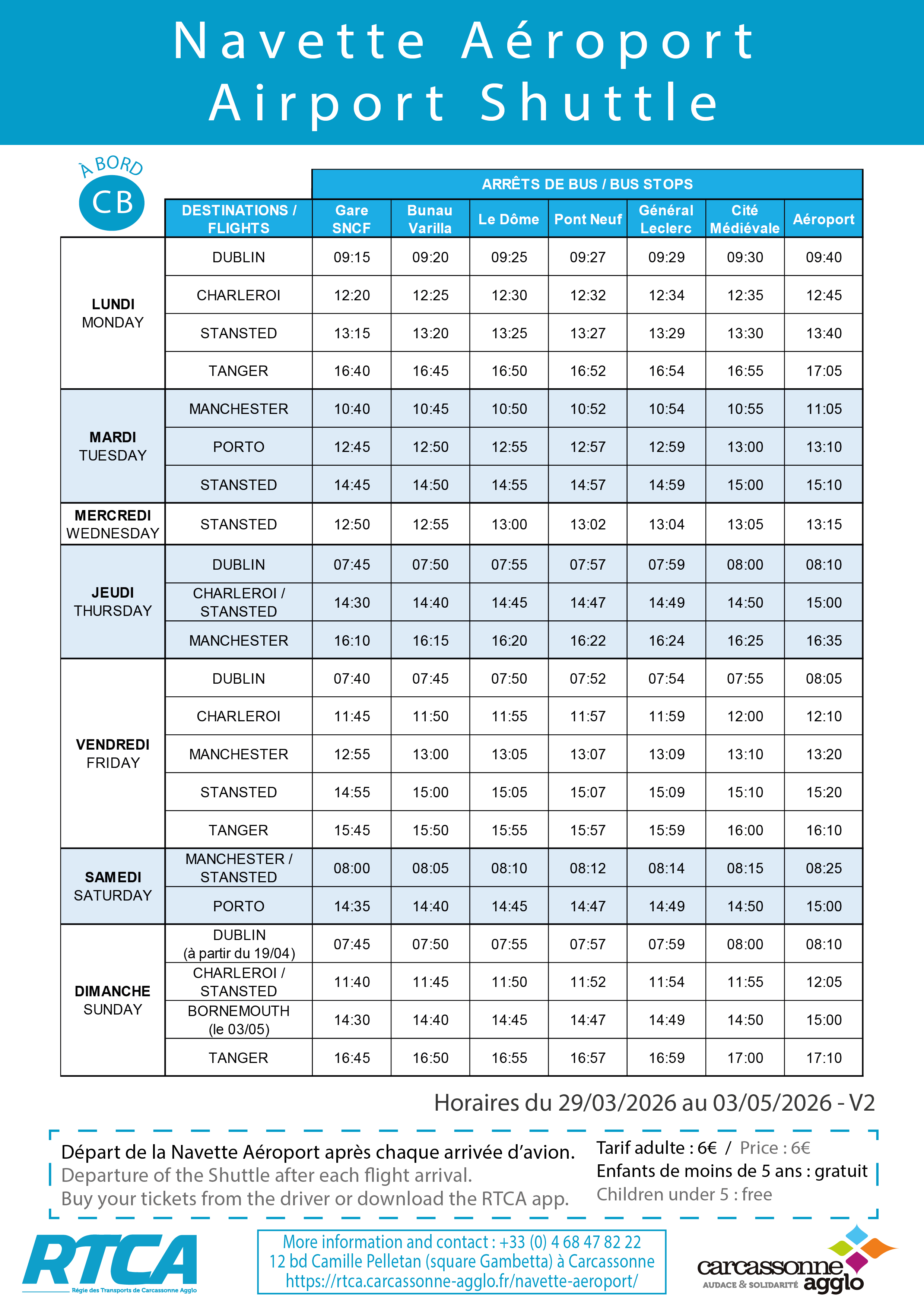 AVRIL- MAI: Fiche horaires de la navette aéroport du 29/03/2026 au 03/05/2026 : cliquez ici.